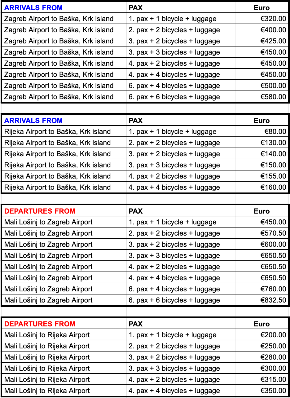 Each transfer is adjusted for the transport of passengers with their personal luggage and bike cases. Each bike must be neatly packed and protected in bike travel bags/cases.